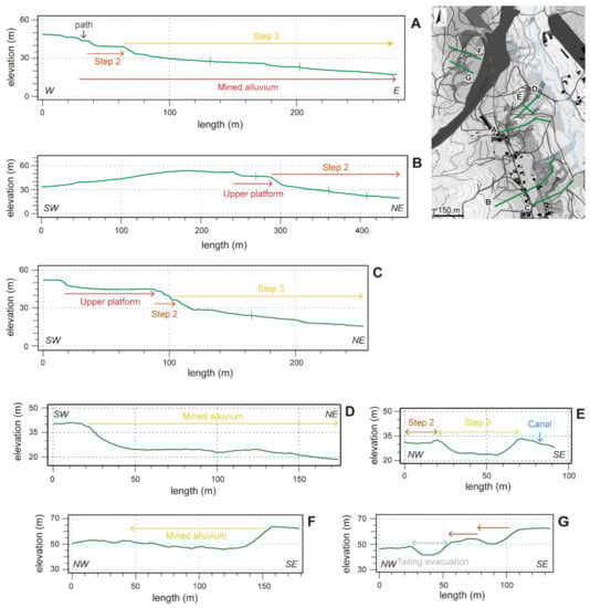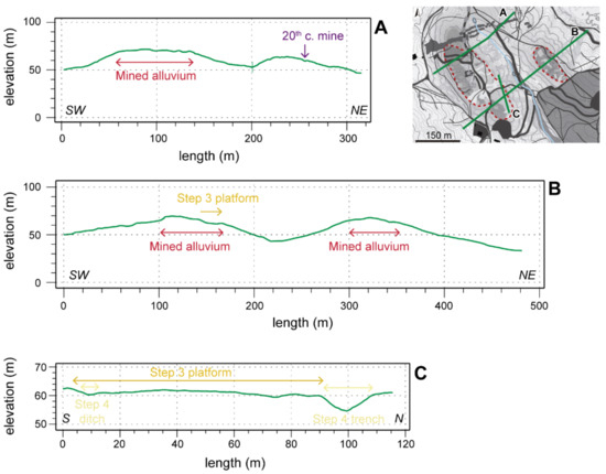 In Sapeiras two ancient mining sectors can be identified: the largest in the west and a smaller one in the east, both at the top of ridges. The mining of the upper alluvium resulted in a flattened area in the western sector and in a more irregular succession of trenches and mounds in the eastern one (see in Figure 13A,B). The trenches on the slopes correspond to the evacuation of the tailings, but some others, larger and deeper, could correspond to the mining of the lower part of the terrace.