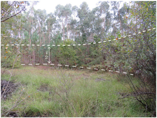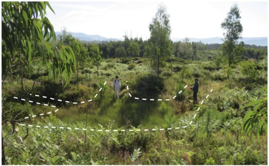 Another interesting structure is the small water tank in the centre of this sector (Figure 12 and Figure 14). It is not clear on the LiDAR data and unrecognisable on the historical imagery, but the prospection on the ground allowed us to confirm its nature. It is a rectangular hollow (9 × 11 m2) delimited by an embankment (20 × 24 m2) with two exit channels on its eastern side and a small depression in the north side of the embankment, that would correspond to the water inlet. Even at the time of prospection during mid-summer, the centre of the structure was wetter than the neighbouring ground. Only the modern road interrupts the exit channels, so the structure must belong to the last phase of ancient mining. This road, following the line of highest elevation in the north, must have been reused and then destroyed the duct supplying water for this small tank. Similar structures are not reported in the literature for ancient alluvium mining in northwest Iberia. The water tanks described are located in the periphery of the mines and have larger dimensions, up to 100 m, as reported in [50]. This one, much smaller and inside the mine, could not have been not designed to remove very high volumes of sediment: both exit channels are quite narrow and do not create large excavations. With this configuration, we can propose that it was used for a last attempt to mine the terrace, at a small scale, or to wash sediments excavated close to it and so separate the cassiterite from the barren clay. An excavation of the structure would be necessary to confirm this hypothesis.