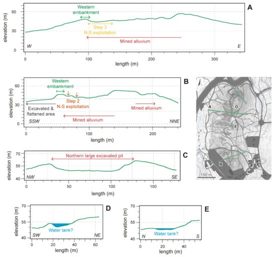 In most of the mine, mining was conducted from the east to the west, following the natural slope. This general frame was, however, modified in some places, as a small embankment (from 1.5 to 4 m high) appears on the western side of the mine (Figure 15, green dot line and Figure 16A,B). In other places, changes in slope orientation helped differentiate the mining phases and highlight the eastward orientation of some trenches of the last period of activity. However, in some cases, this draws small, enclosed structures of 20 to 25 m in diameter and 1.5 to 2.5 m in depth, where some water could remain (Figure 15 and Figure 16D,E). We propose that these structures could correspond to small water tanks. To confirm this, an excavation would be necessary to observe the geomorphological characteristics of their filling and their internal structure. The vegetation is now too dense to ground truth it. Their size, as in the case of Sapeiras, is too small to consider that they were key structures of the main digging work. Anyway, the need for washing the sediments to separate the cassiterite from the clay required the presence of water that could have been at least partially covered by this kind of structure. However, the question of the origin of the water to fill them is unsolved, as no remains of ducts are visible nowadays in this mine.