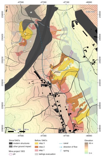 The documents from the mining archives allowed us to confirm if recent mining activity may have overlapped with older structures. These documents are stored at the Arquivo Histórico do Norte do Portugal from the Direção-Geral de Energia e Geologia (DGEG) [38]. Concerning the Viana do Castelo region mining concessions, most of the activity occurred between 1940 and 1960. The documents that brought useful information were the geological and technical reports describing the mining projects, the maps of the concession at scale 1:10,000 and the detailed plans and sections of the mining structures projected, at scales of 1:1000 or 1:2000. In some cases, for underground mining, some plans show the evolution of the works over two or three years. Regarding the opencast mines in alluvium deposits, these archives only included the plans produced for the request of mining permits. The final extension of the mine at the time of cessation has not been registered. All the maps and detailed plans were digitised and georeferenced in GIS to include the location of these recent works in the analysis.