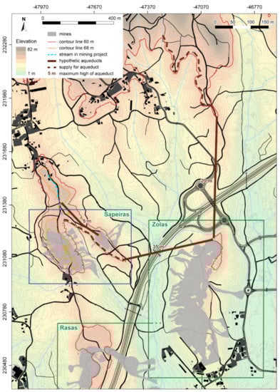 The water supply is a key element for the understanding of the organisation of these ancient mines in secondary deposits [58]. The elevation of the mines in relation to the surrounding terrain and watercourses determines the kind of infrastructure necessary to bring the water to the digging sector. In the Rasas mine, the hydraulic network could be quite simple, considering the actual location of watercourses (Figure 18). The situation is different in Sapeiras and Zolas mines. In Sapeiras, the small water tank and its canal are the few clear elements that we can link to hydraulic structures. The small watercourse springing to the north of the mine could have supplied this small tank. According to military maps, it starts at an elevation a little lower than the canal (67 instead of 69 m), but the topographic map of the mining concession shows that this stream flows from a higher elevation (70 m), along the road (Figure 20). We can suppose that the works to build the road affected the upper course of this stream and are responsible for its current low level of flowing. Nevertheless, some problems remain. First, this watercourse has little flow and seems to be dry in summer, as we could observe during ground-truthing works. This might have been different several centuries ago. Secondly, the maximal level of the stream would be 70 m. This remains below the highest elevation of the western sector of this mine, up to 73 m. In the eastern sector, the highest elevation of the mine is 67 m, which would have been within reach of the stream, even without its northern extension. However, the problem here is the depression going down to 62 m between the eastern sector of the mine and the upper part of the ridge to the north. A channel of around 200 m in length and up to 5m in height would have been necessary to save this depression (Figure 20). This would have been a huge structure, standing out even more compared with the relatively reduced volume of these mining works. No architectural remains are visible now on site, nor are they described in the mining archives. The postulated channel, necessary to bring water to this mining sector, is therefore no more than a hypothesis.