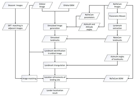 In the Tianwen-1 mission, we performed the visual localization of the Tianwen-1 lander by using the timely orbital, descent and rover images according to the availability of data. The remote landmarks, found in NaTeCam images in horizontal view angle, were identified in the orbital DOM and used to triangulate the lander position as the initial localization result. After completely downlinking the sequential descent images on 29 May, we selected four descent images to refine the initial lander location by using image matching between descent images and the orbital DOM. Finally, the NaTeCam DOM of the landing site was taken to determine the lander location by DOM matching with descent images. Figure 2 shows the workflow of our proposed method.