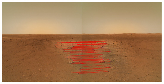 To perform the landmark triangulation-based localization, we applied the cylindrical stitching method to the 12 pairs of NaTeCam images and generated a color panorama for landmark selection. Feature extraction and matching among the NaTeCam images were applied with the Scale-Invariant Feature Transform (SIFT) [25]. The transformation parameters of the projected image, including focus length, translation and rotation, were estimated based on the homographic transformation model. Finally, all images were projected into a pseudo cylindrical surface to generate the mosaic image. Before stitching, image enhancement and simple radiometric correction were applied for better performances in image matching and visualization. Figure 3 shows the SIFT matching results between adjacent NaTeCam images, which were enhanced and radiometrically corrected based on original acquired NaTeCam images.