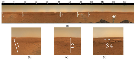 As is shown in Figure 5, the 12 left NaTeCam images, captured atop the landing platform with a pitch angle of −5°, were received at 14:00 pm, 22 May. These images were used to generate the 360° panorama with image stitching, from which the candidate landmarks were also selected.