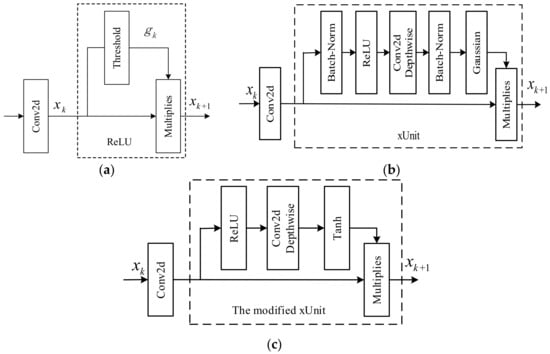 Three activation blocks: (a) the ReLU after derivation, (b) the structure of xUnit, (c) the modified xUnit.