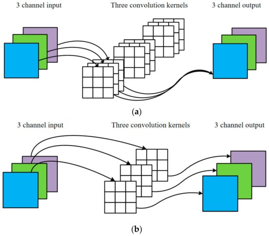 The difference between two convolution operations: (a) ordinary convolution operation, (b) deep convolution operation.