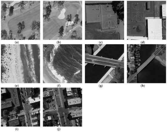 The 10 testing images marked in order from (a) to (j). (a,b) are golf course, (c,d) are basketball court, (e,f) are beach, (g,h) are bridge, (i,j) are medium residential.