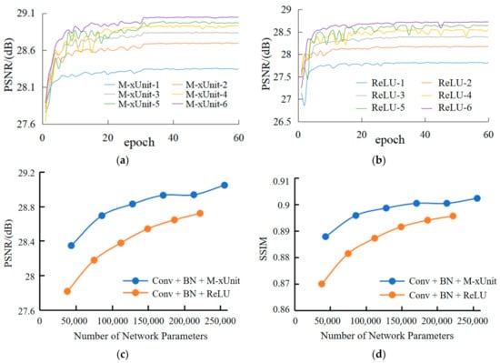 The performance analysis: (a) simulation curves of different “Conv + BN + M-xUnit” layers when L = 10, (b) simulation curves of different “Conv + BN + ReLU” layers when L = 10, (c) the comparison of PSNR between M-xUnit and ReLU, (d) the comparison of SSIM between M-xUnit and ReLU.