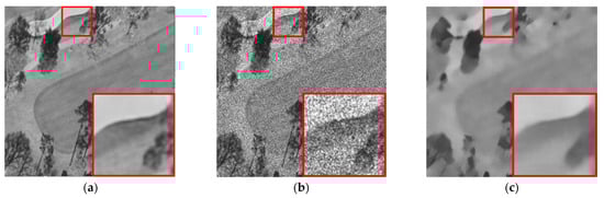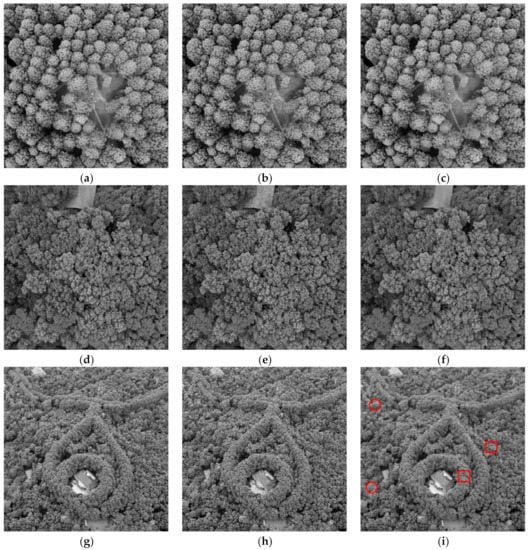 The coniferous forest image had the lowest value (22.75 dB) of PSNR, while the broad-leaved forest image had the highest value (24.94 dB) of PSNR, which shows that the denoising effect of the broad-leaved forest was better than that of the coniferous forest. The closer SSIM was to one, the higher the similarity was between the two images, which resulted in better kept image details. It can be seen that the SSIM of the coniferous forest was 0.778 dB, and that of the broad-leaved forest was 0.806, from which we can infer that the image details of the broad-leaved forest were better preserved after denoising. Because the coniferous and the broad-leaved tree crowns were staggered, the two indices of the conifer broad-leaved mixed forest (PSNR 23.46 dB and SSIM 0.785) were lower than those of the broad-leaved forest and higher than those of the coniferous forest. Figure 12i shows a coniferous trees crown with an ambiguous upper appearance due to information loss caused by insensitivity of activatable functions for minute details (red circle marks) and broad-leaved trees with clear texture (red rectangle marks) because the activatable function had higher recognition of texture.