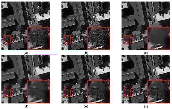 Filtered images of different methods for medium residential test image contaminated by four-look speckle. (a) Original image, (b) noisy image, (c) PPB, (d) SAR-BM3D, (e) ID-CNN, (f) proposed.