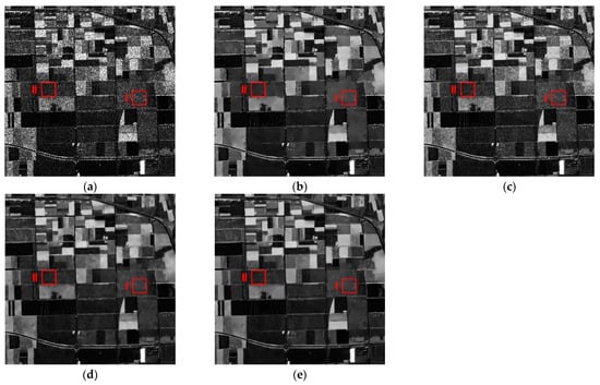 Despeckle results of different methods for the Flevoland SAR image: (a) original; (b) PPB; (c) SAR-BM3D; (d) ID-CNN; (e) proposed.