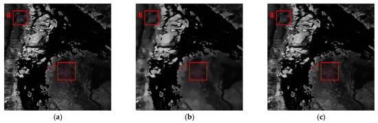 It can be observed that the despeckled result by SAR-BM3D still contained residual speckle noise. Moreover, a few texture distortions were generated after the PPB processing. Based on the visual inspection, the ID-CNN performed almost as well as the proposed method for the despeckling. The difference was quite small. Since there were no speckle-free data for the real SAR images, the ENL was employed to measure the performance of different methods. In Figure 10 and Figure 11, the ENL values are estimated from the two homogeneous regions within the red square.
