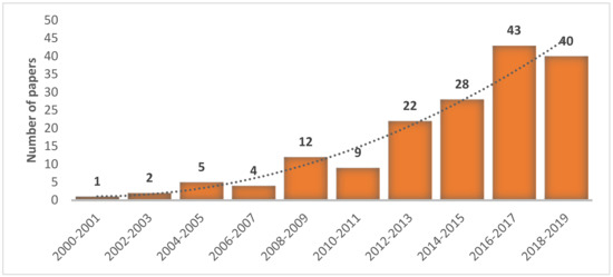 There was still a remarkable difference in the number of articles published in the Northern Hemisphere, specifically in Europe and North America; no studies were consistently conducted outside these two continents until 2015. Only two papers had a worldwide focus or were performed in more than one continent (Figure 2).
