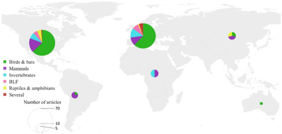 Birds were the most studied taxonomic group (N = 99, 57.2%), followed by mammals (N = 33, 19.1%), invertebrates (N = 18, 10.4%), and BLF (N = 10, 5.8%). Reptiles and amphibians were the least represented group (N = 7, 4%). BLF was the only group where studies have been conducted in North America and Europe, particularly in latitudes above 48°N (Alaska, Canada, Denmark, Finland, Germany, and Norway), except one study predicting biological crust in arid environments in southern Europe [30]. Six articles analyzed more than one taxonomic group (Figure 2).
