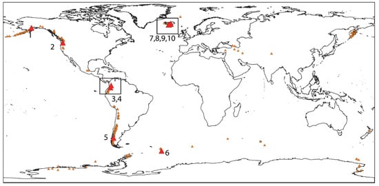 Glacierized volcanoes around the globe (small orange triangles, []) and volcanoes investigated in this study (red triangles, numbered). For some volcanoes, multiple events were investigated. Volcano numbers are detailed in Table 1. Basemap: “World Continents” (accessed on 10 March 2021).