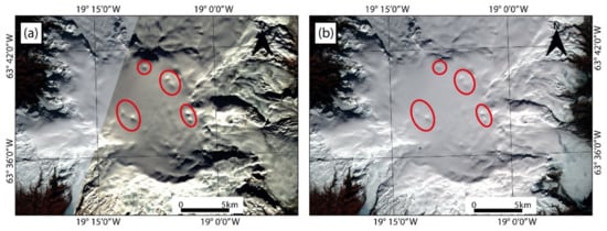 In this study, we have identified some key challenges of using optical satellite images to study volcanic impacts on glaciers. Often, extensive cloud cover and eruption plumes limit the temporal resolution of useful imagery for a specific volcano. This is a problem common to optical remote sensing of many volcanoes globally, not just those that are glacier-clad. One potential solution (though not the focus of this study) is to use SAR satellite data operating in the microwave region of the electromagnetic spectrum, which can penetrate clouds due to a larger wavelength used. For example, crevassing of the glacier surface yields an increased backscatter of amplitude SAR data used to identify ice cauldrons and meltwater tunnels on Mýrdalsjökull []. Supraglacial snow cover also introduces difficulties with observing volcanic impacts on glaciers from optical imagery, since details of the ice surface are often obscured. This is particularly relevant for volcanic events that occur during winter (or the snow season). However, in some cases, snow cover can be an advantage, since it creates a homogeneous surface of low contrast, making subtle changes in topography (e.g., ice surface cauldrons) easier to identify (see Figure 3).