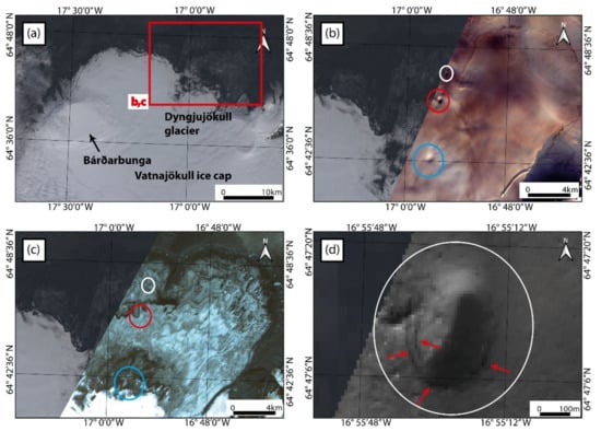 In principle, ice cauldrons are readily detectable with low-resolution satellite imagery, particularly within thick ice. With satellite sensors operating in the visible and near-infrared range (including multispectral and panchromatic bands), cauldrons appear as dark (shaded) areas against the bright ice surface. A period of geothermal activity beneath Mýrdalsjökull between 1999 and 2005 led to the formation of large ice cauldrons, which were identifiable on ASTER visible and near-infrared (VNIR) images (15 m resolution, Figure 2). During the 2014–2015 Bárðarbunga eruption, three cauldrons developed on the surface of Dyngjujökull glacier in the northern part of the Vatnajökull ice cap. These cauldrons are clearly visible as shadows against the snow-covered ice in a true-colour composite EO-1 ALI image (30 m resolution; Figure 3b). However, in a snow-free EO-1 ALI image (Figure 3c), the cauldrons are not visible, since transmitted radiance from the cauldrons region is not distinguishable from the surrounding dirty ice (even though the cauldrons are present at the time of image capture, as shown by Reynolds et al. [] using aerial- and TerraSAR-X imagery). An enlarged view of the northernmost cauldron shows evidence of faint concentric crevassing (Figure 3d).
