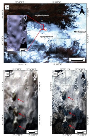 (a) ASTER VNIR (15 m resolution) overview image of Eyjafjallajökull from 01 April 2010, with a small box showing the study area on Gígjökull glacier. The ASTER VNIR image (15 m resolution) in the inset shows the intact glacier surface before the summit eruption. (b) ASTER VNIR (15 m resolution) image and (c) WorldView-1 visible image (2 m resolution), both acquired on 19 April 2010 during the summit eruption showing at least three openings on the glacier surface (red arrows); WorldView-1 image: DigitalGlobe Products. WorldView-1 © 2010 DigitalGlobe, Inc., a Maxar company, Westminster, CO, USA.