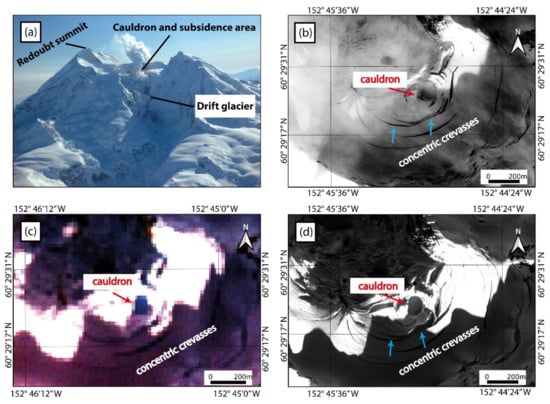 Concentric crevasses related to cauldron formation on ice-covered stratovolcanoes are observed with medium- to high-resolution images, but are too small to be identified with low-resolution images alone. In principle, crevasses can be identified in satellite images as dark fissures on the bright coloured glacial ice and snow. Figure 5a shows Mount Redoubt shortly before its eruption in March 2009, and Figure 5b–d reveal the capabilities of medium- and high-resolution images for ice-cauldron/crevassing detection at this volcano. In this example, the low-resolution ASTER image (Figure 5c) and high-resolution IKONOS-2 image (Figure 5d, 0.8 m resolution) were acquired on the same day. The ice cauldron and concentric crevasses are more clearly visible in the IKONOS-2 image than in the ASTER image due to its high spatial resolution. With high-resolution images, it is not only possible to identify concentric crevasses, but also to accurately monitor their evolution (including changes in their number, length and width). This becomes clear if Figure 5b is compared to Figure 5d. The satellite image in Figure 5b was acquired several days before those of Figure 5c,d and shows a smaller, less evolved cauldron and fewer/smaller crevasses (blue arrows).