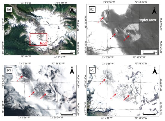 Subglacial dome growth on ice-covered stratovolcanoes commonly results in small-scale crevassing, which is often only visible in medium- to high-resolution images. During the eruption of Mount St Helens from 2004 to 2006, a lava dome gradually developed beneath a small crater-occupying glacier. In the initial stage of the eruption in early October 2004, a melt hole formed in the glacier surface (red arrow in Figure 7b) and parts of East Crater glacier became crevassed due to the onset of lava dome growth (Figure 7b). As the lava dome continued to grow, it extruded through the ice, resulting in the deformation and heavy crevassing of East Crater glacier (Figure 7c,d). The impact of dome growth (ice displacement, crevassing and melt-hole formation) on very small glaciers (~1 km2, 200 m thick) such as the one described are best viewed with at least medium-resolution images such as QuickBird 2 (Figure 7c, 2.4 m). High-resolution images (such as QuickBird-2 panchromatic, 0.6 m) might be required particularly when it comes to small scale crevassing (Figure 7b). The impacts mentioned are less clear in medium-resolution EO-1 ALI panchromatic images (10 m resolution, Figure 7d), and almost impossible to observe in low-resolution imagery (>10 m resolution).