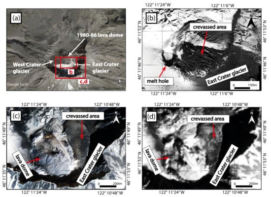 - Schilling, S.P.; Carrara, P.E.; Thompson, R.A.; Iwatsubo, E.Y. Posteruption Glacier Development within the Crater of Mount St. Helens, Washington, USA. Quat. Res. 2004, 61, 325–329. [Google Scholar] [CrossRef]