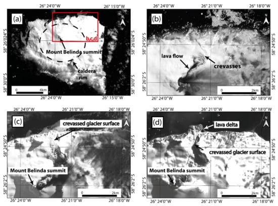 Medium-resolution satellite images (i.e., with resolutions of ~10 m or better) are sufficient to detect crevasses caused by supraglacial lava flows. For example, from 2001–2007, a (mostly effusive) eruption at Mount Belinda (Montagu Island) (Figure 8a) resulted in supraglacial lava flows, which are clearly visible in medium-resolution EO-1 ALI panchromatic imagery (Figure 8b). This medium-resolution imagery also reveals localised crevasses surrounding the supraglacial lava flow (reported by []; see Figure 8b). These crevasses presumably indicate that the lava melted deep channels/gullies into the glacier surface [,,]. These melt-gullies are difficult to observe directly, but their impact on the surrounding ice is observed in medium-resolution imagery.