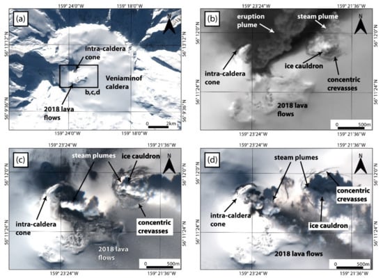 Glacier crevassing is another volcanic impact on glaciers commonly observable from optical satellite images. These crevasses are often localized and concentric (e.g., encircling ice cauldrons), but can also be more widespread, and irregular or linear in form. In fact, all volcanic impacts on glaciers discussed in this paper are, to some degree, associated with crevassing. In principle, crevasses are visible as dark stripes in optical satellite images (Figure 8c), though their detection depends on a notable colour contrast between the crevasse and the surrounding glacial ice and snow. Various approaches have been used to detect widespread regions of crevassing on “non-volcanic” glaciers, using low- to high-resolution optical satellite images [,,,,,]. However, some volcanically-generated glacier crevasses (e.g., those forming around the margins of ice caldrons or those forming related to subglacial dome growth) are often small and comparatively isolated (rather than widespread), meaning that individual landform identification can be challenging, and requires medium- to high-resolution imagery. In addition, when investigating glacierized volcanoes, being able to monitor crevasse development (e.g., crevasses appearing where they were formerly absent) and evolution (e.g., growth) is important. This generally requires imagery with both high spatial and temporal resolution, and is easier for glaciers that are not already heavily crevassed (see Figure 8).