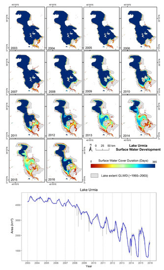 Global WaterPack (GWP) application to monitor the surface water decline of Lake Urmia from 2003–2016. Grey areas refer to the Global Lakes and Wetlands Database (GLWD) [34].