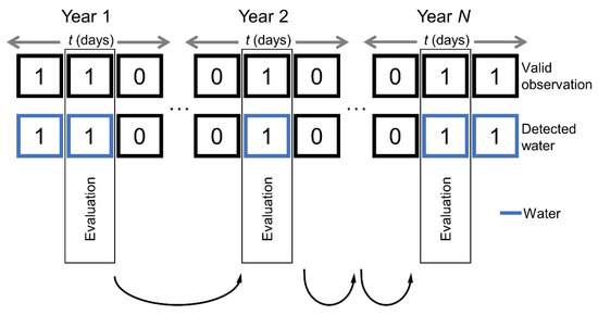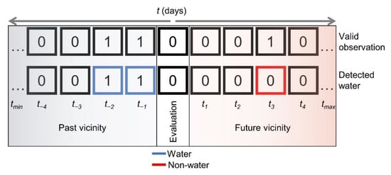 Pixel states of the temporally closest valid observations constitute the most short-term information available. We estimated probability and reliability (pc, rc) by considering the closest valid time series observations (e.g., t−1 and t3 in Figure 4) in an ROI-specific search window. This window is defined by the pixel variabilities given by the long-term layer Va band. By considering the mean variability of pixels that at least changed once (Va > 0), the average number of days until a state change occurs (d) is determined. The search window extent (ts) in which the days of closest past and future observations are identified, is defined according to {ts ∈ ℤ|−d ≤ ts ≤ d}. The information of the two temporally closest detected pixel states (DWcpast, DWcfuture) is combined with respect to their temporal distance to the evaluation day (tc), in order to yield a water probability estimate: