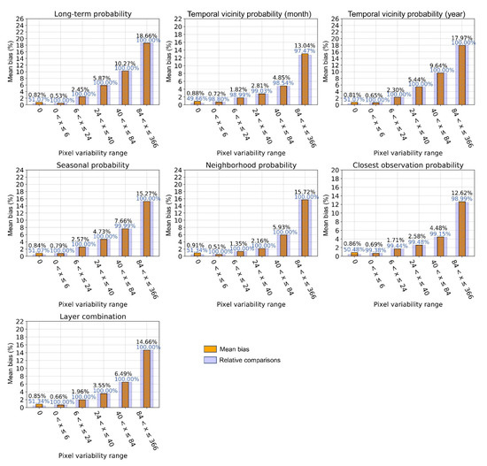 Despite differing evaluation variability ranges of the specific ROIs, results showed similar patterns in all four test sites. With increasing variability, layers that focused on more immediate temporal windows for probability estimation (month-vicinity-, neighborhood- and closest-observation-based probability) had lower bias than long-term-, year-vicinity- and seasonal-probability layers, as well as the combined layer. For relatively static pixels (low variability), better performance was observed for layers considering larger temporal windows. The most challenging test site regarding layer performance was test ROI h18v03 (Figure 7 and Figure 8), as it features considerable cloud coverage and various water variability patterns. Temporal layer performances regarding the highest pixel variability range (variability ≥ 99th percentile) for all test ROIs are shown in Table 1.