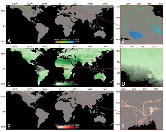 Global long-term water probability (A,B), reliability (C,D) and variability (E,F) for the years 2003–2020.
