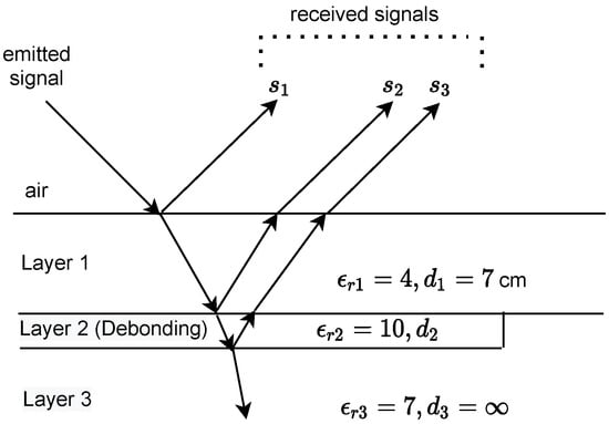 As shown in Figure 1, the defected pavement was modeled as a layered structure in which the debonding (Layer 2) was a thin layer with relative permittivity embedded between Layer 1 and Layer 3, with relative permittivities and , respectively. The pavement structure was probed with an air-coupled step-frequency GPR, of which the pulse was modeled as a Ricker pulse with processed bandwidth ( GHz) and as the central frequency. frequency samples were considered in the data vector. The noise was assumed to be white Gaussian. The thickness of Layer 1 was taken as , and that of Layer 3 was considered infinite. In the RMSE versus SNR simulations, the debonding region was set to ; thus, the times of arrival associated with the backscattered echoes from the top surfaces of Layer 1, the debonding region, and Layer 3 were , respectively. The amplitudes of the backscattered echoes from Layer 1, the debonding, and Layer 3 were found to be , , and , respectively, from the Fresnel equations. Figure 2 displays the shape of the Ricker pulse and the noiseless simulated signals over the debonded () and the healthy areas.