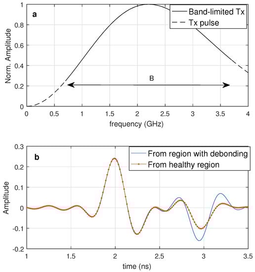 (a) Ricker pulse in the frequency domain with B = ; (b) noiseless simulated signals over the debonded () and the healthy regions of the pavement structure shown in Figure 1.