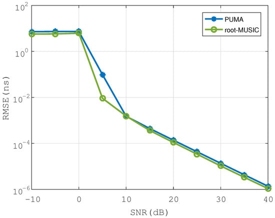 The two selected algorithms were successively applied on the data covariance matrix in (3) and on the FB data covariance matrix defined in (A6). During the processing of the former and the latter, (8) and (14) were computed using the pulse matrix in (2) and derived from (A4), respectively. The RMSE versus the SNR and the RMSE versus plots are shown in Figure 5 and Figure 6, respectively.