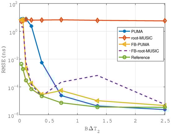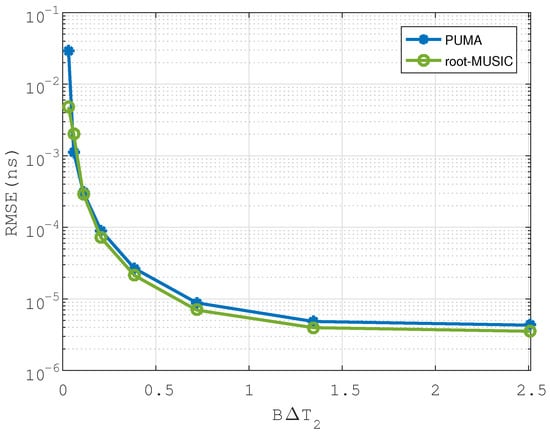 The time resolution of both algorithms is displayed in Figure 6. Figure 6 shows that only PUMA can separate the overlapping echoes, i.e., for , when the algorithms are performed on the data covariance matrix. The time resolution of PUMA and root-MUSIC improved once they were applied to . At (i.e., ), FB-PUMA and FB-root-MUSIC showed similar performance, and they both outperformed PUMA and root-MUSIC. However, the ultimate time resolution stayed lower than the one achieved with fully uncorrelated sources.