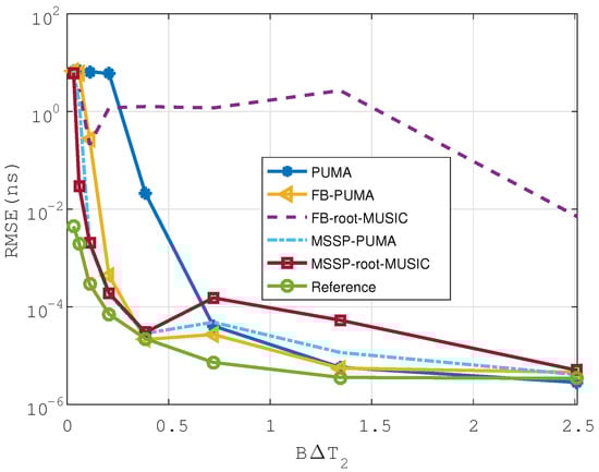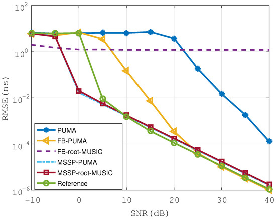 Figure 7 and Figure 8 plot the RMSE of the selected algorithms versus the SNR and , respectively. The performance of root-MUSIC is not plotted because it does not work in the presence of correlated sources. As shown in Figure 7, FB-root-MUSIC failed to work because the FB averaging technique can handle at most two correlated sources. FB-PUMA worked for SNRs dB, thus improving the performance of PUMA, which is limited to SNRs dB. MSSP-PUMA and MSSP-root-MUSIC had a similar performance, and they both outperformed FB-PUMA, FB-root-MUSIC, and PUMA because was of full rank. Surprisingly, MSSP-PUMA and MSSP-root-MUSIC performed better than the reference algorithm at SNRs dB, and MSSP was believed to improve the robustness to noise with its sub-band average.