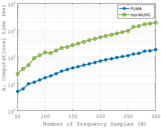 Finally, in Figure 9, the average computational time of PUMA and root-MUSIC for SNR dB is plotted against the size of the data vector N. N was varied from 50 to 300 samples, and the computational time at each number of samples was averaged over 100 runs. The computational time increased with respect to N for both algorithms, with PUMA being about 10-times faster than root-MUSIC. All the simulations were carried out on a PC with Intel Core i5, 4 GB RAM, and .