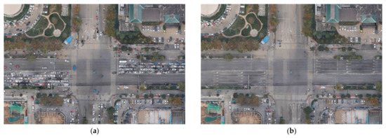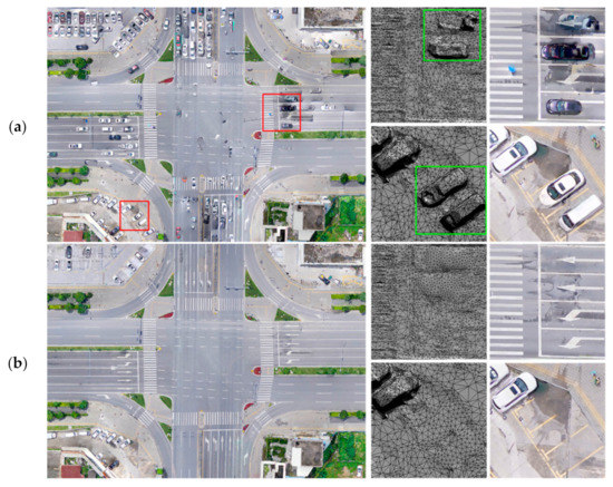 Figure 15 shows the results of moving car removal from the intersection area in Figure 12. Similarly, we reconstruct the 3D scenes in Figure 15a,b using the traditional pipeline and the proposed method, respectively. The entire 3D scene in Figure 15a undoubtedly looks disorganised due to the moving cars. Compared to the results in Figure 15a, we obtain a more accurate and realistic 3D intersection scene after mesh cleaning and texture preprocessing, especially for typical road areas. All the moving vehicles on the road, including undetected buses and vans, are effectively removed, indicating that the proposed method is robust.