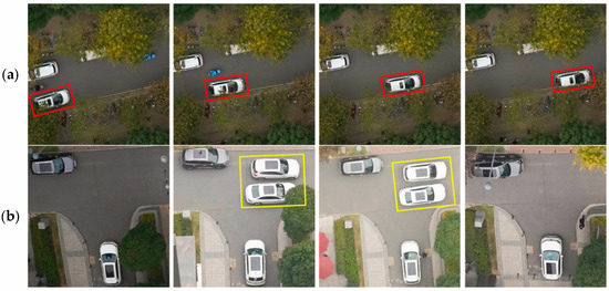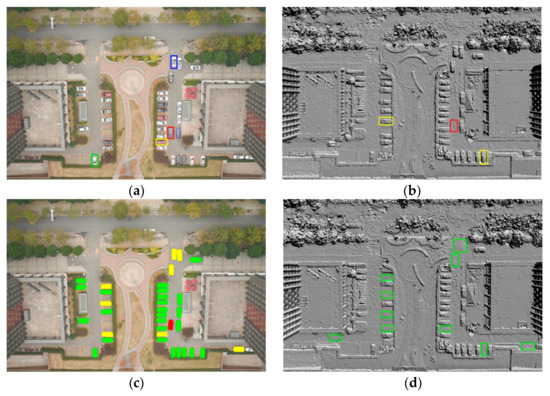As shown in Figure 6, we divide the CMSs into the following three categories: (1) Moving: Cars that were in a driving state during image collection, as indicated by the red line box in Figure 6a; (2) Short stay: Cars that were temporarily stationary and then left during image collection, as shown in the yellow boxes in Figure 6b,c, and in Figure 6c, different cars that are stationary in the same parking region; and (3) Stationary: Cars whose parking positions never changed throughout the whole image collection process, such as the car identified by the green wireframe in Figure 6d.