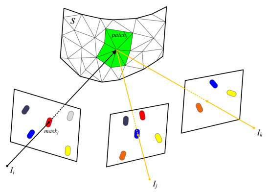 A triangular mesh is a data structure that is commonly used to represent 3D models created by the MVS method; however, there are multiple types of mesh structures, so in this paper, we also apply triangles as the basic computation elements. The geometric structure of an urban scene can be represented by a triangular mesh . We denote the captured images as , and the car masks detected in Section 3.1 for image are denoted by . The perspective projection determined by SfM of image is denoted by , and the projection from mesh onto the image is denoted by . The specific steps for CMS recognition are shown in Algorithm 1: