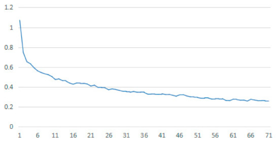 The ground truth of the training datasets for car detection was obtained manually. There are 5000 training samples with different scales, colours and shooting angles. We train the detector for 70 epochs in total and apply 1000 iterations for each epoch. With the experimental environment shown in Table 1, the training time for car detection is approximately 12 h. As depicted in Figure 8, the loss values gradually stabilize as the number of training epochs increases, indicating that the model is close to convergence. By applying the well-trained detector to the validation datasets, we obtain a mean average precision (mAP) of 92.9% for car detection and a precision of 89.7% for car colour recognition.