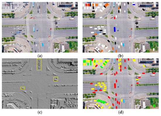 To further verify the effectiveness of the proposed method, we select an intersection area (see Figure 12a) that has a heavy traffic flow and contains various cars in the three different states defined for the experiments. Figure 12b shows the results of car detection in Figure 12a, from which it can be seen that the cars in the scene are well detected. Figure 12d shows the state recognition results of the cars detected in Figure 12b. Figure 12d reveals that the cars on the road are mostly in moving states, while the cars waiting for the traffic lights are likely in the short-stay state. The geometric deformation results of the car models in the yellow boxes in Figure 12c also explain this result. PCS frequently occurs in parking lot spaces (see the top left of Figure 12a). However, unlike Figure 11, more PCS cases occur in this region, where the yellow masks are more than the green masks. Parked cars change more frequently since the parking lot in Figure 12a is in front of a mall.