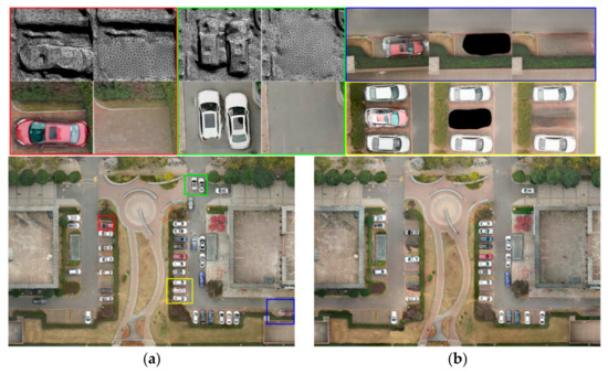 Figure 14 shows the experimental results of moving car removal from the parking lot scene in Figure 11. Two cases (the red and green box regions) were selected from Figure 14a,b, respectively, and demonstrate that our proposed method can better handle the geometry and texture of areas where cars were temporarily stationary. In addition, the parking spaces highlighted by the blue and yellow boxes in Figure 14 are occupied by different cars during the whole process of image acquisition. Therefore, for this kind of region, we need to fill in the texture voids in the images according to the rules in Section 3.3.2. Taking advantage of the algorithm in [53], we obtain a satisfactory region filling result. The comparison results are shown in the blue and yellow boxes in Figure 14.