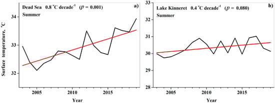 Kishcha, P.; Starobinets, B.; Lechinsky, Y.; Alpert, P. Absence of Surface Water Temperature Trends in Lake Kinneret despite Present Atmospheric Warming: Comparisons with Dead Sea Trends. Remote Sens. 2021, 13, 3461. https://doi.org/10.3390/rs13173461