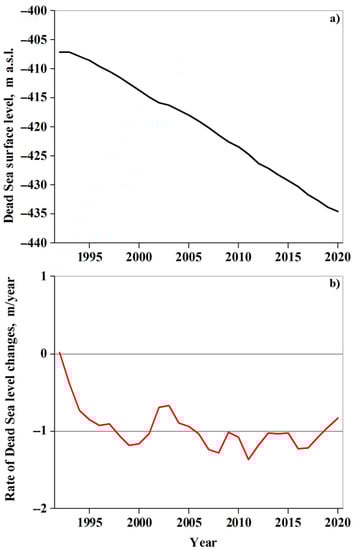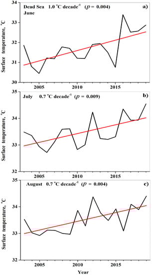 - Kishcha, P.; Pinker, R.T.; Gertman, I.; Starobinets, B.; Alpert, P. Observations of positive sea surface temperature trends in the steadily shrinking Dead Sea. Nat. Hazards Earth Syst. Sci. 2018, 18, 3007–3018. [Google Scholar] [CrossRef]
