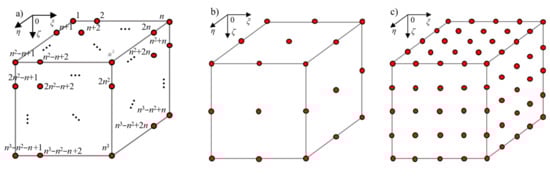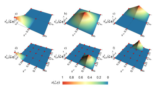 Figure 5a shows the layout and corresponding local index of nodes in the reference mesh for scale j and order m, while Figure 5b,c shows the BSWI21 and BSWI22 elements. Note that the layout of nodes is the same as that in the 3D BSWI basis, however, the basis functions are not exactly the same as the 3D BSWI basis functions because of the transformation matrix.