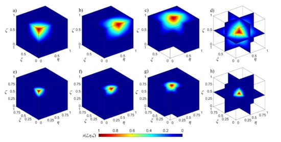 Based on this discussion, 2D and 3D scaling functions are shown in Figure 3 and Figure 4. To avoid confusion, we renumbered them from 1 to n2 for 2D case and from 1 to n3 for 3D case. Figure 3 shows the 2D BSWI scaling functions at the corner (Figure 3a,d), inside (Figure 3b,e), and on the edge (Figure 3c,e) at scale j = 1 and j = 2. Figure 4 shows the 3D BSWI scaling functions at the corner (Figure 4a,e), on the edge (Figure 4b,f), on the surface (Figure 4c,g) and inside (Figure 4d,h) at scale j = 1 and j = 2.