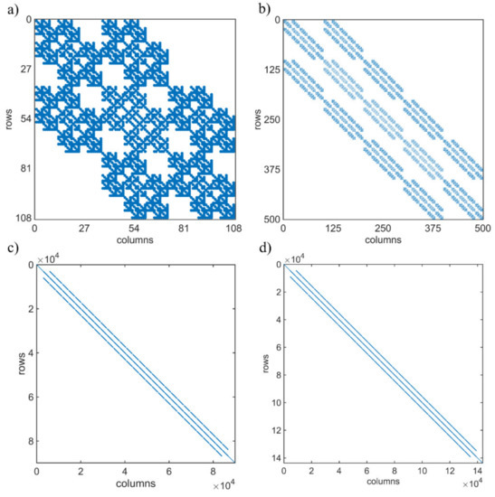 Sparsity pattern of the BSWI-based WFEM: (a) element matrix of BSWI21 elements; (b) element matrix of BSWI22 elements; (c) global matrix when using BSWI21 elements; (d) global matrix when using BSWI22 matrix.