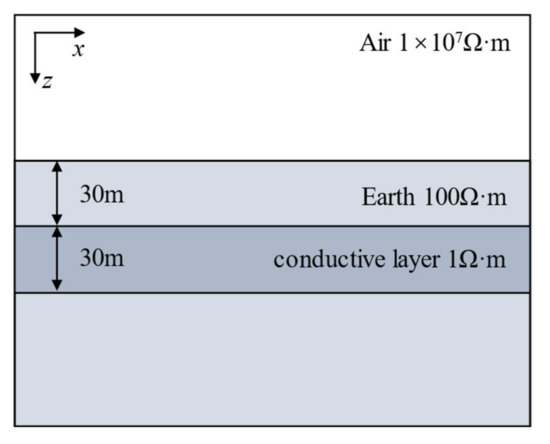 In this section, we first simulate as an example the EM responses of a horizontal coplanar (HCP) AEM system over a homogeneous half-space model to verify the accuracy of our method. The Tx-Rx offset is assumed to be 10m. The flight attitude is 30 m. The earth resistivity is ohm-m. Here, three mesh discretization cases are considered to illustrate how the accuracy can be improved when we refine the mesh or enhance the scale. The model is divided into , and elements, labeled as Case 1, Case 2, and Case 3, in which , and elements are taken as the calculation domain. Meanwhile, the outer boundary is extended 6000 m in each direction. We calculate 21 logarithmically equal-spaced frequencies ranging from 100 Hz to 215 kHz. The results are compared to the 1D semi-analytic solutions calculated using the code from Yin and Fraser [62]. From Figure 7, it is seen that our method obtains high accuracy with only a small number of meshes. For BSWI21 elements in Case 1, the relative errors of both the real and the imaginary part are not able to meet our needs. The maximum relative error can be up to about 15%. This is simply because the mesh discretization is too rough. After the mesh refinement from Case 1 to Case 2, we can see that the relative error shows a sharp reduction, with the relative error reduced to less than 5%. Meanwhile, the time cost is only about 15 s for one frequency (see Table 1). For comparison purposes, we further refine the mesh to Case 3. The result shows that in this case the relative error of the real part becomes less than 1% for most frequencies, while the error of the imaginary part is lower than that of the real part with a maximum value of 1%. This indicates that the results from our method are very accurate. As for the BSWI22 elements, the relative error in Case 1 is already under 1% for most frequencies. However, at very high frequencies the error keeps rising to about 8%. However, after the mesh is refined in Case 2, we can obtain similar accuracy as that in Case 3 using BSWI21 elements. The maximum relative error of the real part is about 3% at 215 kHz while that of the imaginary part is under 0.6% at all frequencies. This indicates again that the accuracy can be improved when the scale of BSWI basis is increased. From Table 1 it is seen that the BSWI22 elements lead to a system with more DOFs than BSWI21 elements. As a result, the corresponding time cost becomes higher. Since the results are accurate enough, we do not continue refining the mesh. From this example, we can obviously see that the BSWI-based WFEM depends less on meshes so that one can simulate the EM response with fewer meshes than the conventional FEM. At the same time, as the high-scale functions can describe the unknown field at high resolutions, so we can improve the accuracy by increasing the scale. This provides double tracks for improving the accuracy in our modeling process.