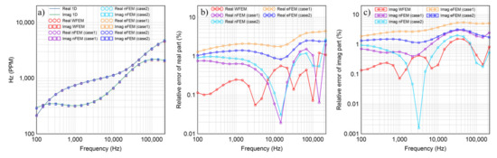 Comparison of WFEM, the edge-based and nodal-based FEM for the model in Figure 8: (a) comparison of EM responses; (b) relative error of the real part; (c) relative error of the imaginary part.